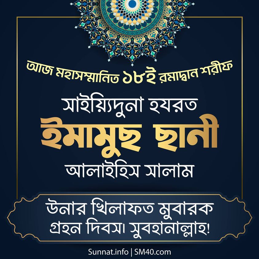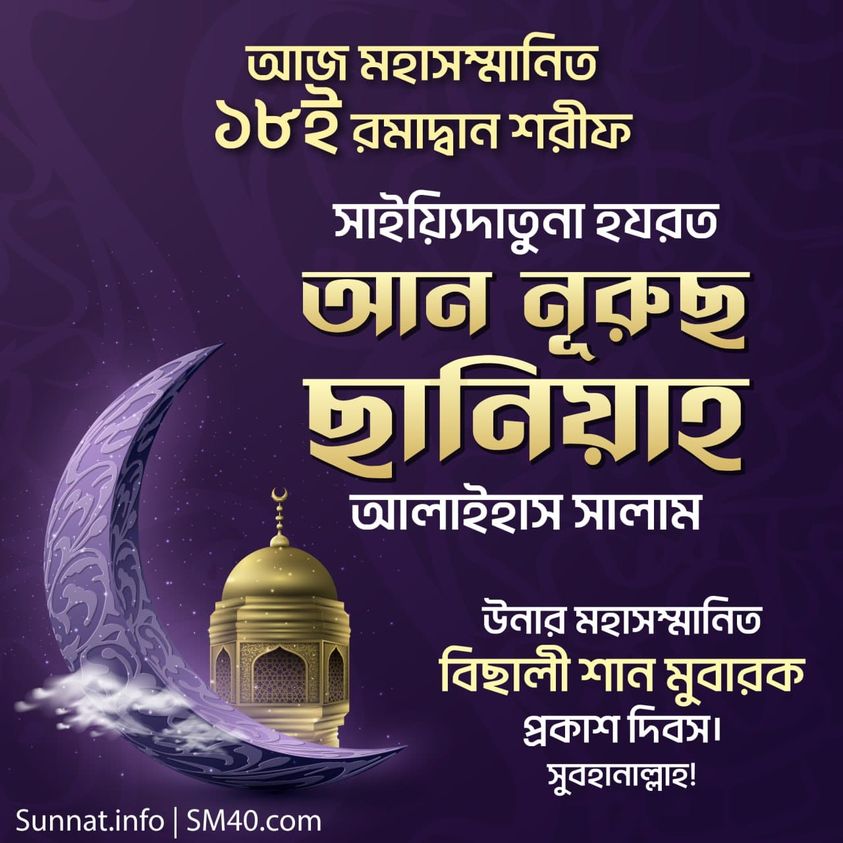 ছাহিবাতু সাইয়্যিদিল আ’দাদ শরীফ, সাইয়্যিদাতু নিসায়িল আলামীন, হাবীবাতুল্লাহ, ছাহিবায়ে নেয়ামত, রহমাতুল্লিল আলামীন, আহলু বাইতি রসূলিল্লাহ ছল্লাল্লাহু আলাইহি ওয়া সাল্লাম, ক্বায়িম মাক্বামে হযরত উম্মাহাতুল মু’মিনীন আলাইহিন্নাস সালাম, সাইয়্যিদাতুনা হযরত উম্মুল উমাম আলাইহাস সালাম তিনি বলেন, খ¦ালিক, মালিক, রব, মহান আল্লাহ পাক তিনি ইরশাদ মুবারক করেন-“হে ঈমানদারগণ! মহান আল্লাহ পাক উনাকে ভয় করার মতো ভয় করুন এবং মুসলমান না হয়ে ইন্তিকাল করবেন না।” অর্থাৎ ঈমানদা বাকি অংশ পড়ুন...