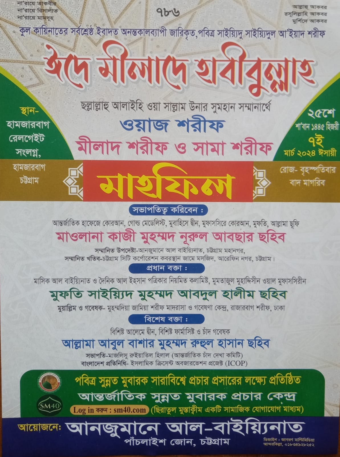পবিত্র সাইয়্যিদু সাইয়্যিদিল আ'ইয়াদ শরীফ উপলক্ষে গত ২৬-৮-১৪৪৫ হিজরী, লাইলাতুল জুমুয়াহ (বৃহস্পতিবার দিবাগত রাতে) চট্রগ্রামের পাঁচলাইশ থানায় ছাত্র আনজুমানে আল বাইয়্যিনাতের উদ্দ্যেগে এক বিরাট ওয়াজ ও দোয়ার মাহফিল অনুষ্ঠিত হয়।