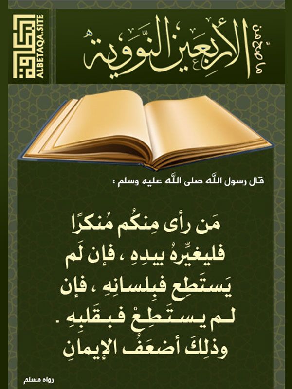 مَنْ رَأَى مِنْكُمْ مُنْكَرًا فَلْيُغَيِّرْهُ بِيَدِهِ فَإِنْ لَمْ يَسْتَطِعْ فَبِلِسَانِهِ فَإِنْ لَمْ يَسْتَطِعْ فَبِقَلْبِهِ وَذَلِكَ أَضْعَفُ الإِيمَانِ وفى رواية لَيْسَ وَرَاءَ ذَلِكَ مِنَ الْإِيمَانِ حَبَّةُ خَرْدَلٍ