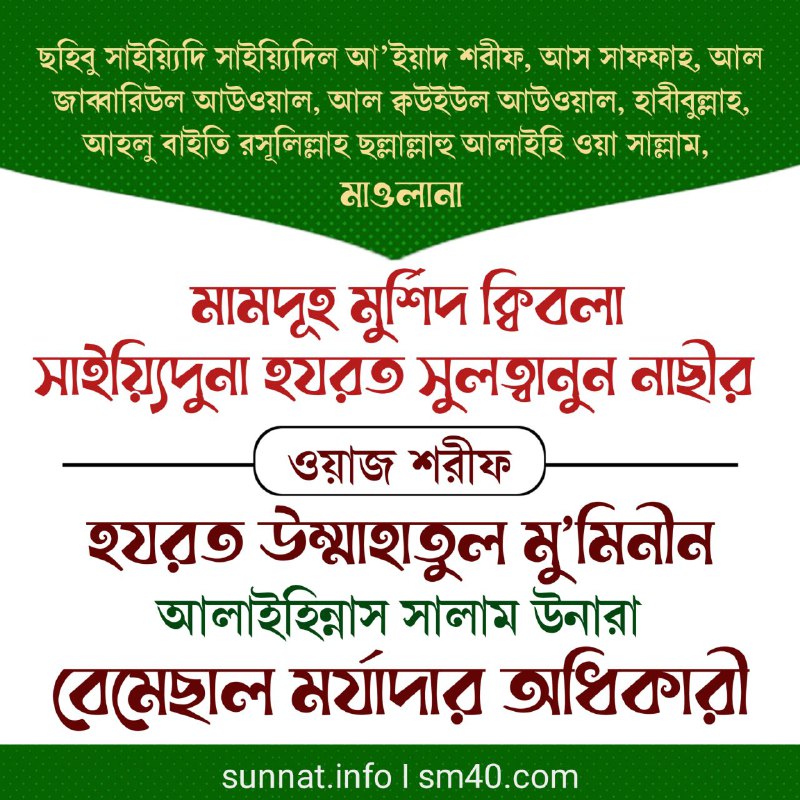 যিনি খ্বালিক যিনি মালিক যিনি রব মহান আল্লাহ পাক তিনি হযরত উম্মাহাতুল মু’মিনীন আলাইহিন্নাস সালাম উনাদের খুছূছিয়ত মুবারক সম্পর্কে পবিত্র কালামুল্লাহ শরীফ উনার মধ্যে বর্ণনা মুবারক করেছেন। মহান আল্লাহ পাক উনার অসংখ্য ও অগণিত নিয়ামত মুবারকের মধ্যে কুল-কায়িনাতের সর্বশ্রেষ্ঠ নিয়ামত মুবারক হচ্ছেন, হযরত উম্মাহাতুল মু’মিনীন আলাইহিন্নাস সালাম উনারা। সুবহানাল্লাহ! হযরত উম্মাহাতুল মু’মিনীন আলাইহিন্নাস সালাম উনাদের খুছূছিয়ত মুবারক, বৈশিষ্ট্য মুবারক সম্পর্কে যিনি খ্বালিক যিনি মালিক যিনি রব মহান আল্লাহ পাক তিনি ইরশাদ মুবারক কর বাকি অংশ পড়ুন...