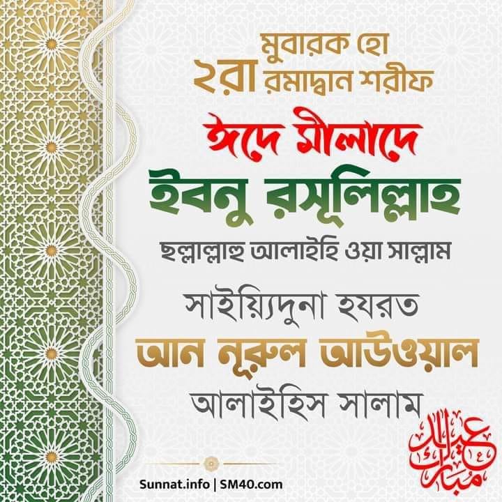 অর্থ: সাইয়্যিদুল মুরসালীন, ইমামুল মুরসালীন, নূরে মুজাসসাম, হাবীবুল্লাহ হুযূর পাক ছল্লাল্লাহু আলাইহি ওয়া সাল্লাম তিনি উনার মহাসম্মানিতা আম্মাজান সাইয়্যিদাতুনা হযরত উম্মু রসূলিল্লাহ ছল্লাল্লাহু আলাইহি ওয়া সাল্লাম উনার খিদমত মুবারক-এ থাকাবস্থায় (মহান আল্লাহ পাক উনার তরফ থেকে) প্রতি মাসে আসমান ও যমীনে ঘোষণা দ বাকি অংশ পড়ুন...