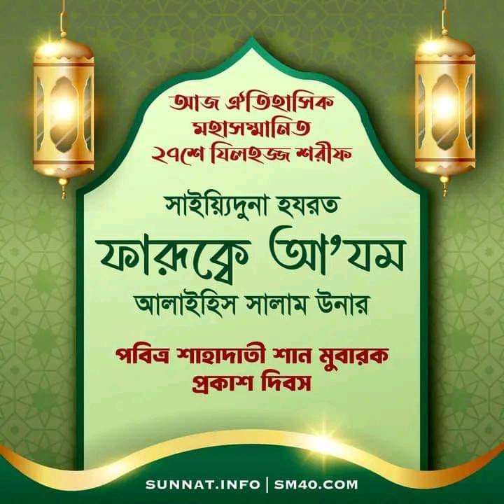অর্থ: “হযরত কাররামাল্লাহু ওয়াজহাহু আলাইহিস সালাম তিনি বলেন, নূরে মুজাসসাম হাবীবুল্লাহ হুযূর পাক ছল্লাল্লাহু আলাইহি ওয়া সাল্লাম তিনি ইরশাদ মুবারক করেন, তোমরা সাইয়্যিদুনা হযরত ফারূক্বে আ’যম আলাইহিস সালাম উনার অসন্তুষ্টি মুবারক উনাকে ভয় করো। কেননা, নিশ্চয়ই মহান আল্লাহ পাক তিনি তখন অসন্তুষ্ট মুবারক প্রকাশ করেন, যখন সাইয়্যিদুনা হযরত ফারূক্বে আ’যম আলাইহিস সালাম তিনি অ বাকি অংশ পড়ুন...
