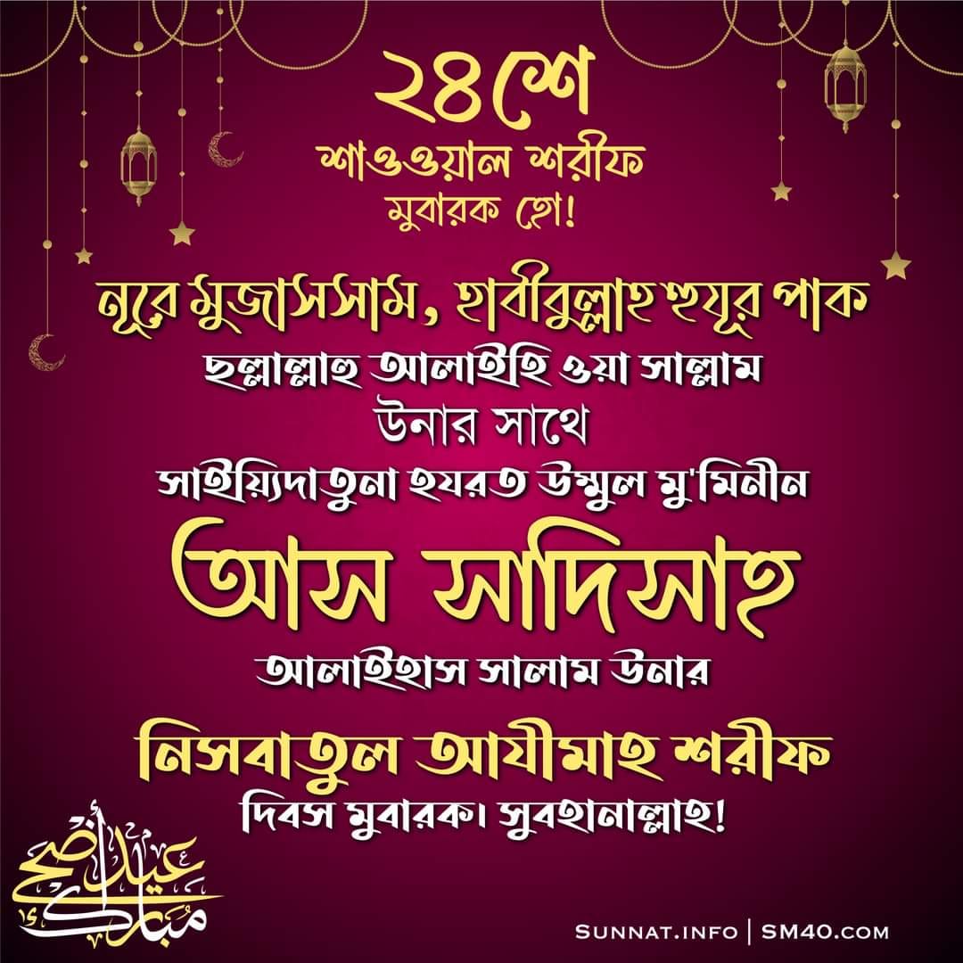 আজ মহিমান্বিত ২৪শে শাওওয়াল শরীফ। সুবহানাল্লাহ! নূরে মুজাসসাম হাবীবুল্লাহ হুযূর পাক ছল্লাল্লাহু আলাইহি ওয়া সাল্লাম উনার সাথে সাইয়্যিদাতুন নিসায়ি আলাল আলামীন, আফদ্বলুন নাস ওয়ান নিসা বা’দা রসূলিল্লাহ ছল্লাল্লাহু আলাইহি ওয়া সাল্লাম, সাইয়্যিদাতুনা হযরত উম্মুল মু’মিনীন আস সাদিসাহ আলাইহাস সালাম উনার পবিত্র নিসবাতুল আযীমাহ শরীফ দিবস। সুবহানাল্লাহ! পাশাপাশি সাইয়্যিদাতুনা হযরত সাইয়্যিদাতুল উমাম আস সাদিসাহ আলাইহাস সালাম উনার পবিত্র বিলাদতী শান মুবারক প্রকাশ দিবস। সুবহানাল্লাহ!