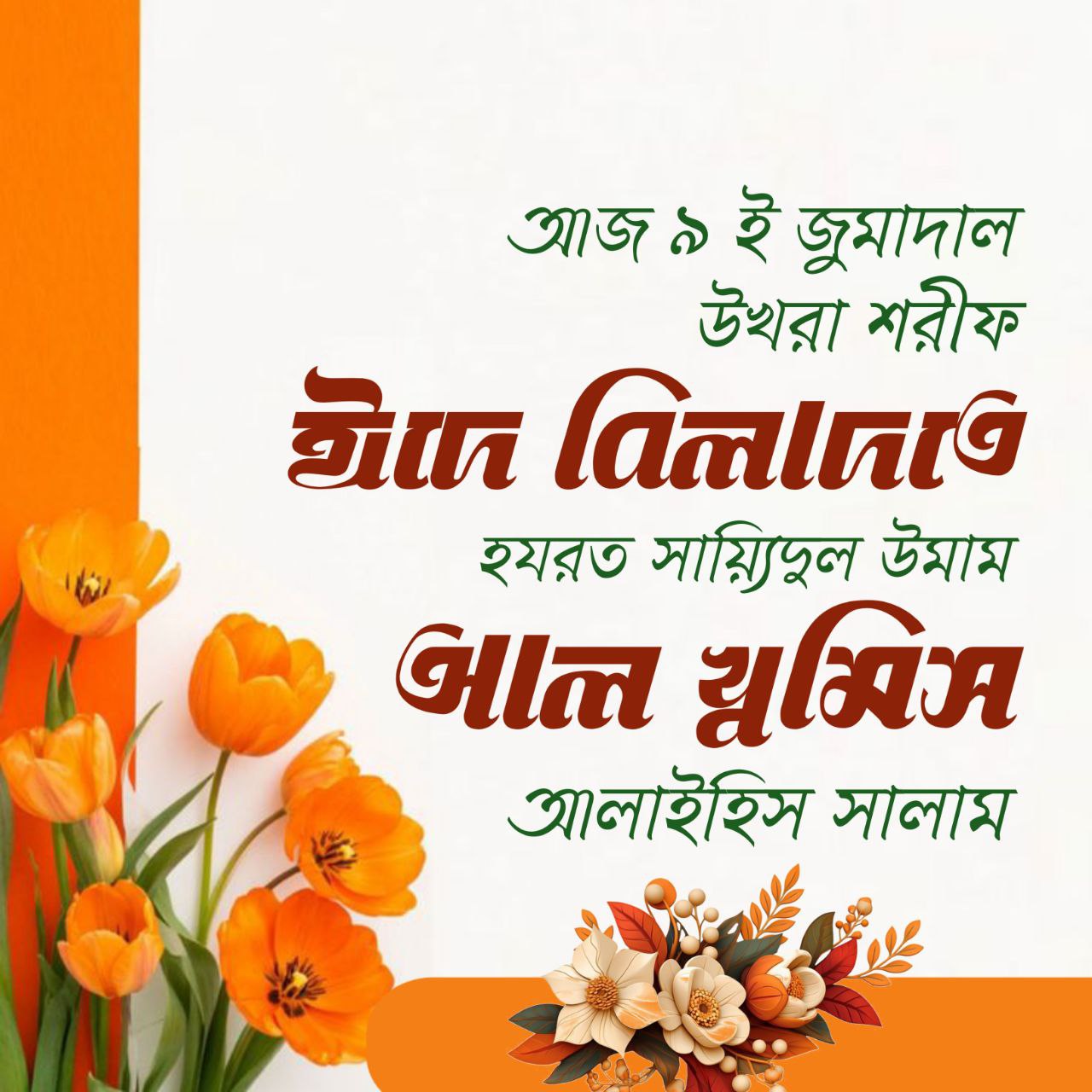 আহলু বাইতি রসূলিল্লাহ ছল্লাল্লাহু আলাইহি ওয়া সাল্লাম, ক্বায়িম মাক্বামে সিব্তু রসূলিল্লাহ ছল্লাল্লাহু আলাইহি ওয়া সাল্লাম সাইয়্যিদুনা হযরত সাইয়্যিদুল উমাম আল খ্বামিস আলাইহিস সালাম তিনি মহাসম্মানিত ও মহাপবিত্র ৯ই জুমাদাল উখরা শরীফ লাইলাতুছ ছুলাছা শরীফ (মঙ্গলবার রাত) ১২টা ২৭ মিনিটে মহাসম্মানিত ও মহাপবিত্র বরকতময় বিলাদতী শান মুবারক প্রকাশ করেন। সুবহানাল্লাহ!