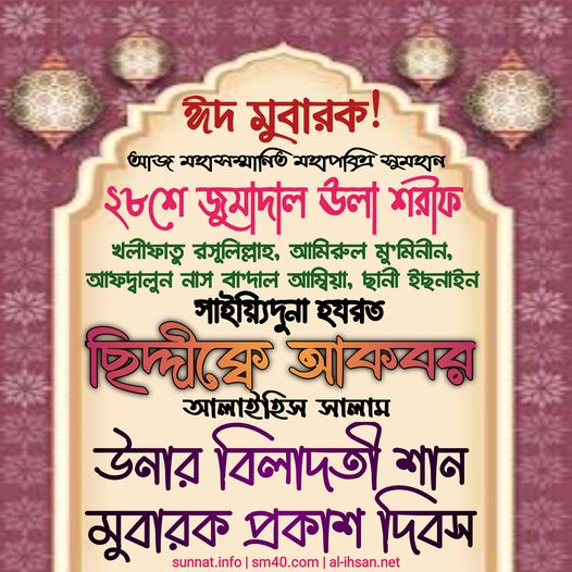 রহমাতুল্লিল ‘আলামীন, ছাহিবু সাইয়্যিদি সাইয়্যিদিল আ’ইয়াদ শরীফ, ইমামুল আইম্মাহ্, মুজাদ্দিদুয যামান, কুতুবুল আলম, মুহইউস সুন্নাহ, মাহিউল বিদয়াহ, গাউছুল আ’যম, আযীযুয যামান, ক্বইউমুয যামান, আল জাব্বারিউল আউওয়াল, আল ক্বউইউল আউওয়াল, আস সাফফাহ, হাবীবুল্লাহ, আহলু বাইতি রসূলিল্লাহ ছল্লাল্লাহু আলাইহি ওয়া সাল্লাম, মাওলানা মামদূহ মুর্শিদ ক্বিবলা সাইয়্যিদুনা হযরত সুলত্বানুন নাছীর আলাইহিস সালাম তিনি বলেন, আজ সুমহান বরকতময় মহাসম্মানিত ও মহাপবিত্র ২১শে জুমাদাল ঊলা শরীফ। সুবহানাল্লাহ! রবীবাতু রসূলিল্লাহ ছল্লাল্লাহু আলাইহি ওয়া সাল্লাম স বাকি অংশ পড়ুন...
