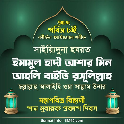 এবং সাইয়্যিদুনা হযরত ইমামুল হাদী ‘আশার মিন আহলি বাইতি রসূলিল্লাহি ছল্লাল্লাহু আলাইহি ওয়া সাল্লাম উনার মহাসম্মানিত বিলাদতী শান মুবারক প্রকাশ দিবস। সুবহানাল্লাহ!