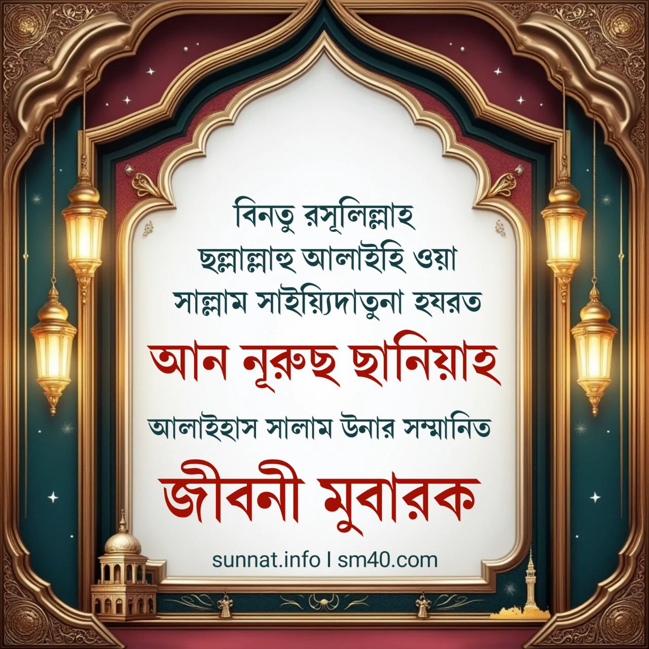 সাইয়্যিদাতুন নিসায়ি ‘আলাল আলামীন, উম্মু আবীহা, বিনতু রসূলিল্লাহ ছল্লাল্লাহু আলাইহি ওয়া সাল্লাম সাইয়্যিদাতুনা হযরত আন নূরুছ ছালিছাহ আলাইহাস সালাম উনার সবচেয়ে বড় পরিচয় মুবারক হচ্ছেন, তিনি হলেন নূরে মুজাসসাম হাবীবুল্লাহ হুযূর পাক ছল্লাল্লাহু আলাইহি ওয়া সাল্লাম উনার সম্মানিত বানাত (মেয়ে) আলাইহাস সালাম। সুবহানাল্লাহ! নূরে মুজাসসাম হাবীবুল্লাহ হুযূর পাক ছল্লাল্লাহু আলাইহি ওয়া সাল্লাম উনার সম্মানিত হযরত বানাত আলাইহিন্নাস সালাম উনাদের মধ্যে তিনি হচ্ছেন ‘আছ ছালিছাহ তথা তৃতীয়া’। সুবহানাল্লাহ! তিনি শুধু মহান আল্লাহ পাক তিনি ন বাকি অংশ পড়ুন...