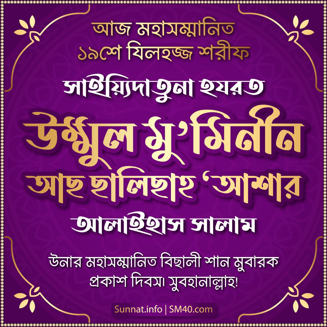 রহমাতুল্লিল ‘আলামীন, ছাহিবু সাইয়্যিদি সাইয়্যিদিল আ’ইয়াদ শরীফ, ইমামুল আইম্মাহ্, মুজাদ্দিদুয যামান, কুতুবুল আলম, মুহইউস সুন্নাহ, মাহিউল বিদয়াহ, গাউছুল আ’যম, আযীযুয যামান, ক্বইউমুয যামান, আল জাব্বারিউল আউওয়াল, আল ক্বউইউল আউওয়াল, আস সাফফাহ, হাবীবুল্লাহ, আহলু বাইতি রসূলিল্লাহ ছল্লাল্লাহু আলাইহি ওয়া সাল্লাম, মাওলানা মামদূহ মুর্শিদ ক্বিবলা সাইয়্যিদুনা হযরত সুলত্বানুন নাছীর আলাইহিস সালাম তিনি বলেন, মহাসম্মানিত হযরত উম্মাহাতুল মু’মিনীন আলাইহিন্নাস সালাম উনারা ছিলেন মোট ১৩ জন। সুবহানাল্লাহ! সাইয়্যিদুল মুরসালীন, ইমামুল মুরসালীন, বাকি অংশ পড়ুন...