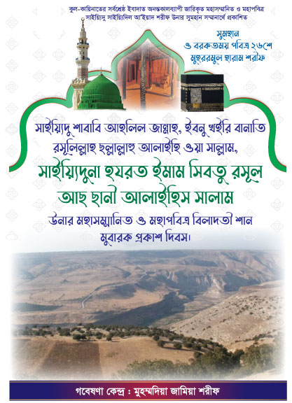 রহমাতুল্লিল ‘আলামীন, ছাহিবু সাইয়্যিদি সাইয়্যিদিল আ’ইয়াদ শরীফ, ইমামুল আইম্মাহ্, মুজাদ্দিদুয যামান, কুতুবুল আলম, মুহইউস সুন্নাহ, মাহিউল বিদয়াহ, গাউছুল আ’যম, আযীযুয যামান, ক্বইউমুয যামান, আল জাব্বারিউল আউওয়াল, আল ক্বউইউল আউওয়াল, আস সাফফাহ, হাবীবুল্লাহ, আহলু বাইতি রসূলিল্লাহ ছল্লাল্লাহু আলাইহি ওয়া সাল্লাম, মাওলানা মামদূহ মুর্শিদ ক্বিবলা সাইয়্যিদুনা হযরত সুলত্বানুন নাছীর আলাইহিস সালাম তিনি বলেন, উম্মু আবীহা, খইরু ওয়া আফদ্বালু বানাতি রসূলিল্লাহ ছল্লাল্লাহু আলাইহি ওয়া সাল্লাম সাইয়্যিদাতুনা হযরত আন নূরুল ঊলা আলাইহাস সালাম উনার বাকি অংশ পড়ুন...