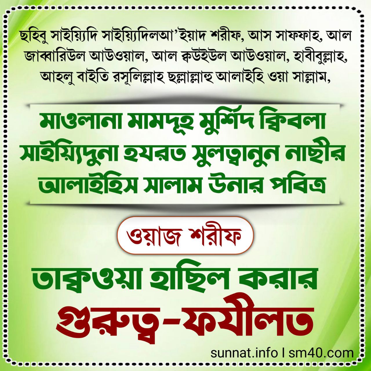 হে ঈমানদারগণ, তোমরা মহান আল্লাহ পাক ও উনার রসূল, নূরে মুজাসসাম, হাবীবুল্লাহ হুযূর পাক ছল্লাল্লাহু আলাইহি ওয়া সাল্লাম উনার অগ্রগামী হয়ো না এবং মহান আল্লাহ পাক উনাকে ভয় করো। নিশ্চ বাকি অংশ পড়ুন...