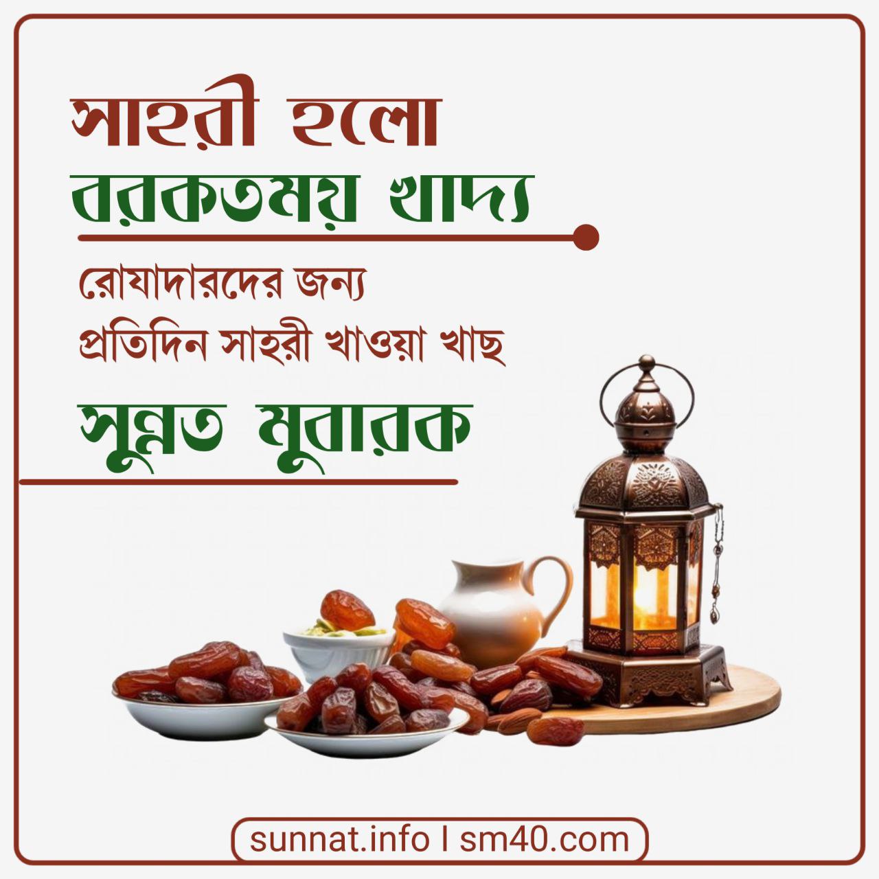 নূরে মুজাসসাম হাবীবুল্লাহ হুযূর পাক ছল্লাল্লাহু আলাইহি ওয়া সাল্লাম তিনি সাহরী খাওয়ার জন্য নির্দেশ মুবারক প্রদান করেছেন এবং সাহরী খাওয়ার ফযীলত বর্ণনা মুবারক করেছেন: