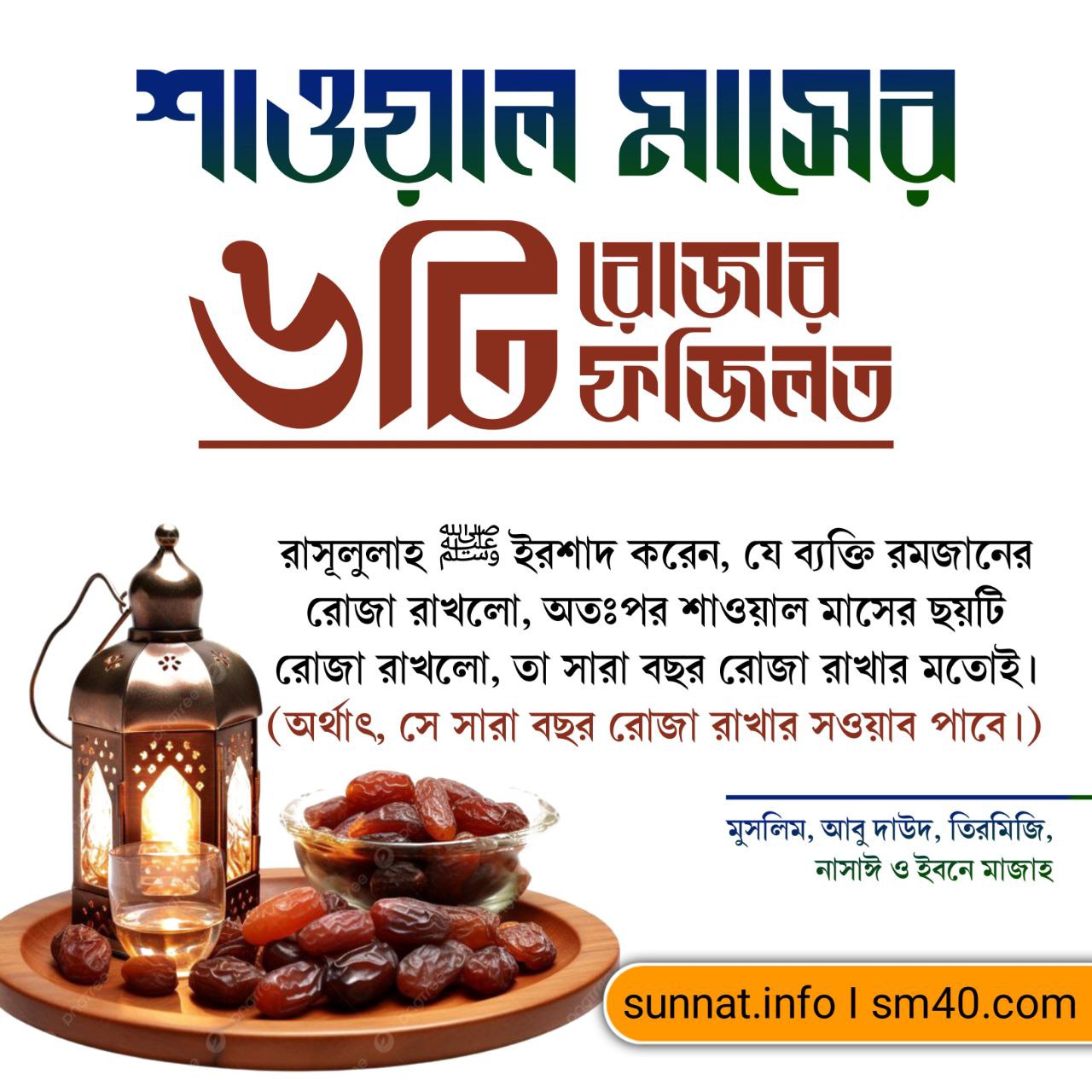 পবিত্র হাদীছ শরীফ উনার মধ্যে পবিত্র শাওওয়াল শরীফ মাসে ৬টি রোযা রাখার গুরুত্ব, ফযীলত সম্পর্কে ইরশাদ মুবারক হয়েছে: