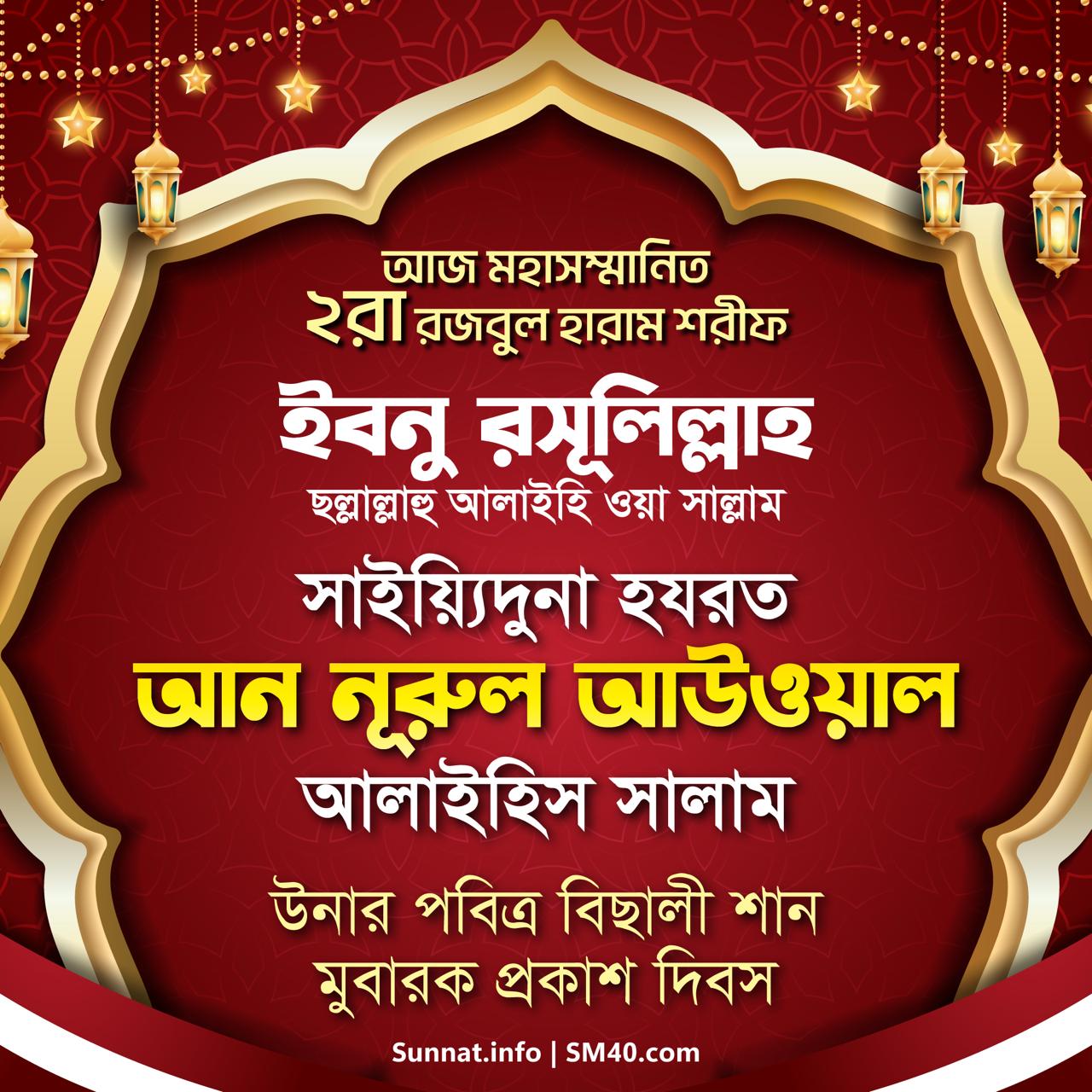 আহলু বাইতি রসূলিল্লাহ ছল্লাল্লাহু আলাইহি ওয়া সাল্লাম, ক্বায়িম মাক্বামে হাবীবুল্লাহ ছল্লাল্লাহু আলাইহি ওয়া সাল্লাম, রহমাতুল্লিল আলামীন মামদূহ মুর্শিদ ক্বিবলা সাইয়্যিদুনা হযরত সুলত্বানুন নাছীর আলাইহিস সালাম তিনি ১৪৪০ হিজরী শরীফ উনার মহাসম্মানিত পহেলা রজবুল হারাম শরীফ সাইয়্যিদু সাইয়্যিদিল আ’ইয়াদ শরীফ উনার মাহফিল মুবারক-এ ইরশাদ মুবারক করেন, “আজকে এই মহাসম্মানিত রজবুল হারাম শরীফ উনার পহেলা রাত্রি মুবারক। আমরা সাধারণভাবে মহাসম্মানিত ২২শে জুমাদাল ঊলা শরীফ বিশেষভাবে পালন করি। এই পহেলা রজবুল হারাম শরীফ দো‘আর ইন্তিযাম করা বাকি অংশ পড়ুন...