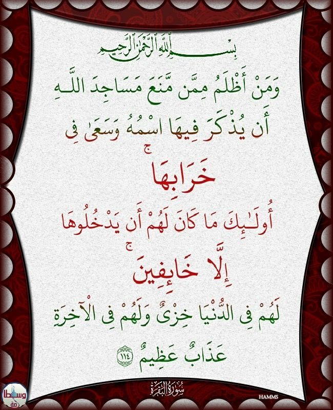 وَمَنْ أَظْلَمُ مِمَّنْ مَنَعَ مَسَاجِدَ اللهِ أَنْ يُذْكَرَ فِيهَا اسْمُهٗ وَسَعَى فِي خَرَابِهَا اُولٰئِكَ مَا كَانَ لَهُمْ اَنْ يَدْخُلُوهَا إِلَّا خَائِفِينَ لَهُمْ فِي الدُّنْيَا خِزْيٌ وَلَهُمْ فِي الْاٰخِرَةِ عَذَابٌ عَظِيمٌ.