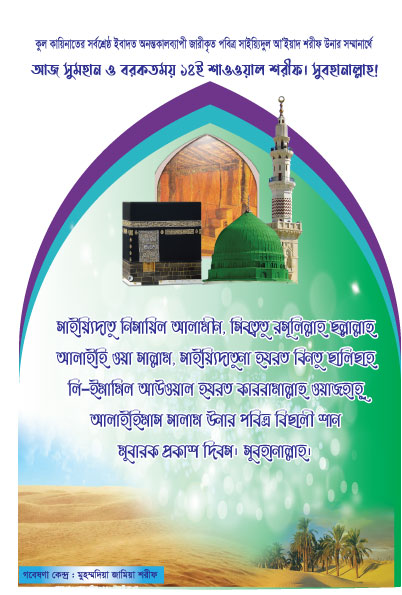 সাইয়্যিদু সাইয়্যিদিল আ’ইয়াদ শরীফ, সাইয়্যিদে ঈদে আ’যম শরীফ, সাইয়্যিদে ঈদে আকবর শরীফ পবিত্র ঈদে বিলাদতে রসূলিল্লাহ ছল্লাল্লাহু আলাইহি ওয়া সাল্লাম অর্থাৎ পবিত্র সাইয়্যিদু সাইয়্যিদিল আ’ইয়াদ শরীফ এমন মহাসম্মানিত ঈ বাকি অংশ পড়ুন...