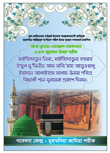 সব প্রশংসা মুবারক খালিক্ব মালিক রব মহান আল্লাহ পাক উনার জন্য; যিনি সকল সার্বভৌম ক্ষমতার মালিক। সাইয়্যিদুল মুরসালীন, ইমামুল মুরসালীন, নবী আলাইহিমুস সালাম উনাদের নবী, রসূল আলাইহিমুস সালাম উনাদের রসূল, নূরে মুজাসসাম, হাবীবুল্লাহ হুযূর পাক ছল্লাল্লাহু আলাইহি ওয়া সাল্লাম উনার প্রতি অফুরন্ত দুরূদ শরীফ ও সালাম মুবারক।