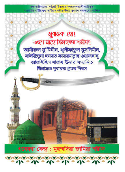 রহমাতুল্লিল ‘আলামীন, ছাহিবু সাইয়্যিদি সাইয়্যিদিল আ’ইয়াদ শরীফ, ইমামুল আইম্মাহ্, মুজাদ্দিদুয যামান, কুতুবুল আলম, মুহইউস সুন্নাহ, মাহিউল বিদয়াহ, গাউছুল আ’যম, আযীযুয যামান, ক্বইউমুয যামান, আল জাব্বারিউল আউওয়াল, আল ক্বউইউল আউওয়াল, আস সাফফাহ, হাবীবুল্লাহ, আহলু বাইতি রসূলিল্লাহ ছল্লাল্লাহু আলাইহি ওয়া সাল্লাম, মাওলানা মামদূহ মুর্শিদ ক্বিবলা সাইয়্যিদুনা হযরত সুলত্বানুন নাছীর আলাইহিস সালাম তিনি বলেন, খলীফায়ে ছানী, আমীরুল মু’মিনীন, সাইয়্যিদুনা হযরত ফারূক্বে আ’যম আলাইহিস সালাম তিনি পবিত্র যিলহজ্জ শরীফ মাস উনার ২৭ তারিখ ইয়াওমুস সাব্ বাকি অংশ পড়ুন...