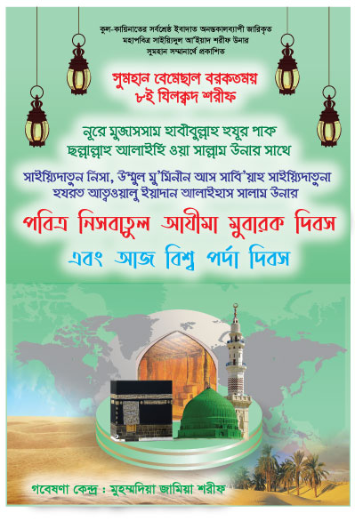রহমাতুল্লিল ‘আলামীন, ছাহিবু সাইয়্যিদি সাইয়্যিদিল আ’ইয়াদ শরীফ, ইমামুল আইম্মাহ্, মুজাদ্দিদুয যামান, কুতুবুল আলম, মুহইউস সুন্নাহ, মাহিউল বিদয়াহ, গাউছুল আ’যম, আযীযুয যামান, ক্বইউমুয যামান, আল জাব্বারিউল আউওয়াল, আল ক্বউইউল আউওয়াল, আস সাফফাহ, হাবীবুল্লাহ, আহলু বাইতি রসূলিল্লাহ ছল্লাল্লাহু আলাইহি ওয়া সাল্লাম, মাওলানা মামদূহ মুর্শিদ ক্বিবলা সাইয়্যিদুনা হযরত সুলত্বানুন নাছীর আলাইহিস সালাম তিনি বলেন, মহান আল্লাহ পাক তিনি ইরশাদ মুবারক করেন, “মহান আল্লাহ পাক তিনি উনার সম্মানিত হাবীব, নূরে মুজাসসাম হাবীবুল্লাহ হুযূর পাক ছল্লাল্লাহু আ বাকি অংশ পড়ুন...