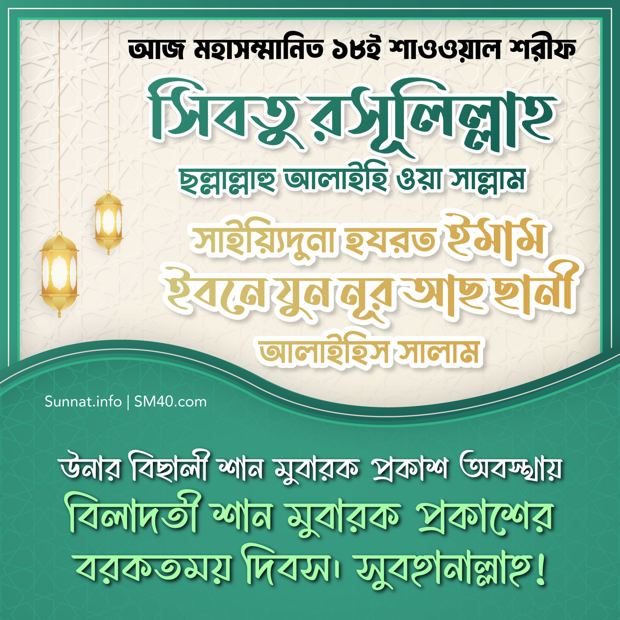 রহমাতুল্লিল ‘আলামীন, ছাহিবু সাইয়্যিদি সাইয়্যিদিল আ’ইয়াদ শরীফ, ইমামুল আইম্মাহ্, মুজাদ্দিদুয যামান, কুতুবুল আলম, মুহইউস সুন্নাহ, মাহিউল বিদয়াহ, গাউছুল আ’যম, আযীযুয যামান, ক্বইউমুয যামান, আল জাব্বারিউল আউওয়াল, আল ক্বউইউল আউওয়াল, আস সাফফাহ, হাবীবুল্লাহ, আহলু বাইতি রসূলিল্লাহ ছল্লাল্লাহু আলাইহি ওয়া সাল্লাম, মাওলানা মামদূহ মুর্শিদ ক্বিবলা সাইয়্যিদুনা হযরত সুলত্বানুন নাছীর আলাইহিস সালাম তিনি বলেন, নূরে মুজাসসাম হাবীবুল্লাহ হুযূর পাক ছল্লাল্লাহু আলাইহি ওয়া সাল্লাম উনার মহাসম্মানিত হযরত আব্বা আলাইহিস সালাম তিনি এবং মহাসম্মানি বাকি অংশ পড়ুন...