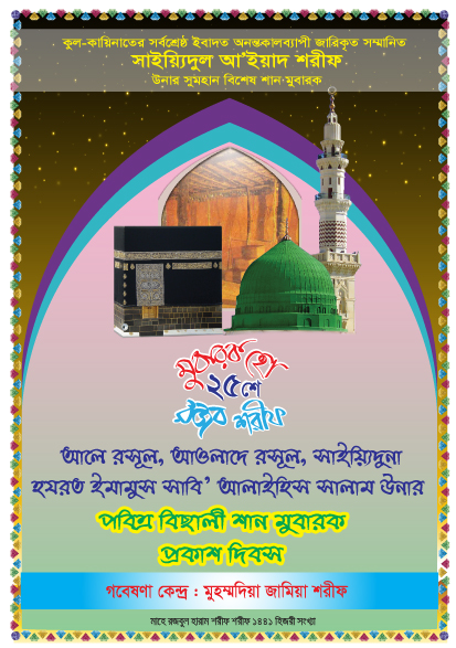 রহমাতুল্লিল ‘আলামীন, ছাহিবু সাইয়্যিদি সাইয়্যিদিল আ’ইয়াদ শরীফ, ইমামুল আইম্মাহ্, মুজাদ্দিদুয যামান, কুতুবুল আলম, মুহইউস সুন্নাহ, মাহিউল বিদয়াহ, গাউছুল আ’যম, আযীযুয যামান, ক্বইউমুজ জামান, আল জাব্বারিউল আউওয়াল, আল ক্বউইউল আউওয়াল, আস সাফফাহ, হাবীবুল্লাহ, আহলু বাইতি রসূলিল্লাহ ছল্লাল্লাহু আলাইহি ওয়া সাল্লাম, মাওলানা মামদূহ মুর্শিদ ক্বিবলা সাইয়্যিদুনা হযরত সুলত্বানুন নাছীর আলাইহিস সালাম তিনি বলেন, পবিত্র কুরআন শরীফ উনার ‘পবিত্র সূরা দুখান শরীফ’ উনার মধ্যে পবিত্র শবে বরাত অর্থাৎ লাইলাতুল বরাত শরীফ উনাকে ‘লাইলাতুম মুবারাকাহ’ বা বাকি অংশ পড়ুন...
