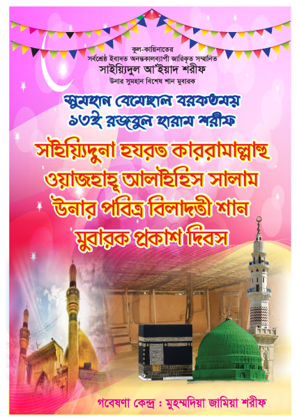 খলীফাতুল্লাহ, খলীফাতু রসূলিল্লাহ, ছাহিবু সাইয়্যিদি সাইয়্যিদিল আ’ইয়াদ শরীফ, আস সাফফাহ, আল জাব্বারিউল আউওয়াল, আল ক্বউইউল আউওয়াল, হাবীবুল্লাহ, মুত্বহ্হার, মুত্বহ্হির, আহলু বাইতি রসূলিল্লাহ ছল্লাল্লাহু আলাইহি ওয়া সাল্লাম, ক্বায়িম মাক্বামে হাবীবুল্লাহ ছল্লাল্লাহু আলাইহি ওয়া সাল্লাম, মাওলানা মামদূহ মুর্শিদ ক্বিবলা সাইয়্যিদুনা হযরত সুলত্বানুন নাছীর আলাইহিস সালাম তিনি বলেন, আজ পবিত্র ২২শে রজবুল হারাম শরীফ। আজ খাজা আবূ তালিব এবং সাইয়্যিদুনা হযরত মুয়াবিয়া রদ্বিয়াল্লাহু তায়ালা আনহু উনাদের পবিত্র বিছালী শান মুবারক প্রকাশ দিবস। বাকি অংশ পড়ুন...