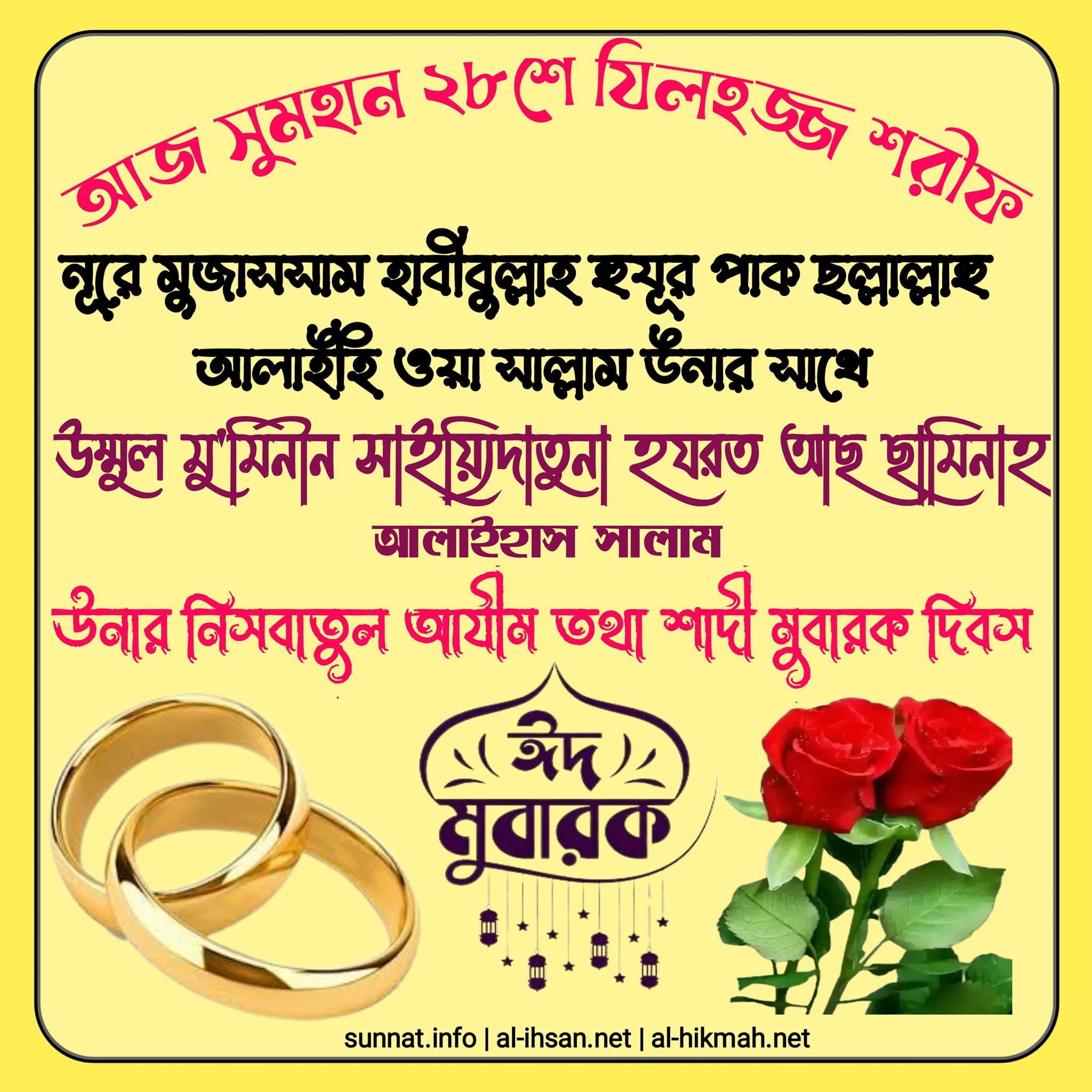 অর্থ: “উম্মুল মু’মিনীন সাইয়্যিদাতুনা হযরত আল আশিরাহ্ আলাইহাস সালাম তিনি একবার স্বপ্ন মুবারকে দেখলেন যে আকাশের চাঁদখানা উনার মহাসম্মানিত নূরুল আযহার মুবারকে (কোল মুবারকে) তাশরীফ মুবারক নিয়েছেন। সুবহানাল্লাহ! অন্য বর্ণনা রয়েছেন- তিনি স্বপ্ন মুবারকে দেখেছেন আসমানের সূর্যখানা উনার মহাসম্মানিত নূরুল ইলিম মুবারকে (বক্ষ মুবারকে) তাশরীফ মুবারক নিয়েছেন। সুবহানাল্লাহ! তিনি এই স্বপ্ন মুবারকখানা উনার পি বাকি অংশ পড়ুন...