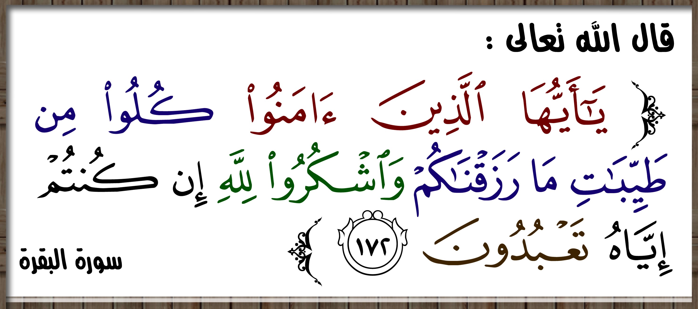 মহান আল্লাহ পাক তিনি ইরশাদ মুবারক করেন, “হে ঈমানদারগণ! আমি তোমাদের যে হালাল খাদ্য দিয়েছি, সেখান থেকে তোমরা খাদ্য গ্রহণ করো এবং মহান আল্লাহ্ পাক উনার শুকরিয়া আদায় করো। (সূরা বাক্বারা শরীফ, পবিত্র আয়াত শরীফ ১৭২)