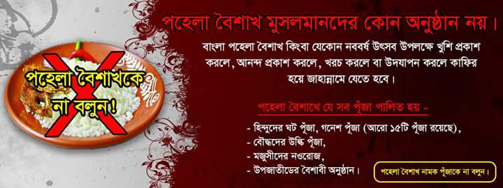 ফসলী সন তথা বাংলা সনের প্রথম দিন পহেলা বৈশাখ মূলত বিজাতীয়-বিধর্মীদের উৎসব। পহেলা বৈশাখের আগের দিন চৈত্র সংক্রান্তি পূজা আর পহেলা বৈশাখ হলো ঘট পূজা, গনেশ পূজার দিন এছাড়া আরো অনেক পূজা রয়েছে। বৌদ্ধরা এইদিনে উল্কিপূজা করে। মজুসীরা (অগ্নিউপাসকরা) এই দিন নওরোজ উৎসব পালন করে। উপজাতিরা বৈশাখী অনুষ্ঠান পালন করে থাকে। নাউযুবিল্লাহ! তাহলে দেখা যাচ্ছে পহেলা বৈশাখে মুসলমানগণের কোনো অংশ নেই।