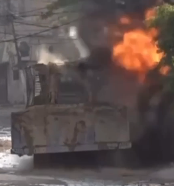 পশ্চিম তীরের জেনিনে সন্ত্রাসী ইসরাইলি আগ্রাসনের সময় ক্যাম্পের প্রবেশমুখে ১টি সামরিক বুলডোজারকে বিস্ফোরক ডিভাইস দ্বারা টার্গেট করেছে আল-কুদস ব্রিগেড যোদ্ধারা।