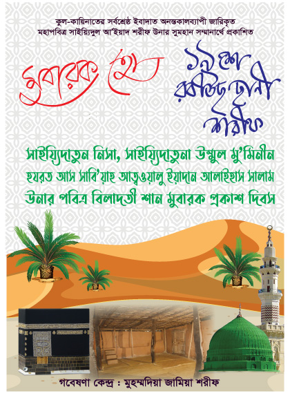 আনুষ্ঠানিকভাবে সম্মানিত নুবুওওয়াত ও রিসালাত মুবারক প্রকাশের ২০ বছর পূর্বে পবিত্র মাহে রবীউছ ছানী শরীফ উনার ১৯ তারিখ ইয়াওমুল জুমু‘য়াহ্ শরীফ সাইয়্যিদাতুনা হযরত উম্মুল মু’মিনীন আস সাবি’য়াহ আলাইহাস সালাম তিনি পবিত্র মক্কা শরীফে বিলাদতী শান মুবারক প্রকাশ করেন। সুবহানাল্লাহ! (দৈনিক আল-ইহসান শরীফ)