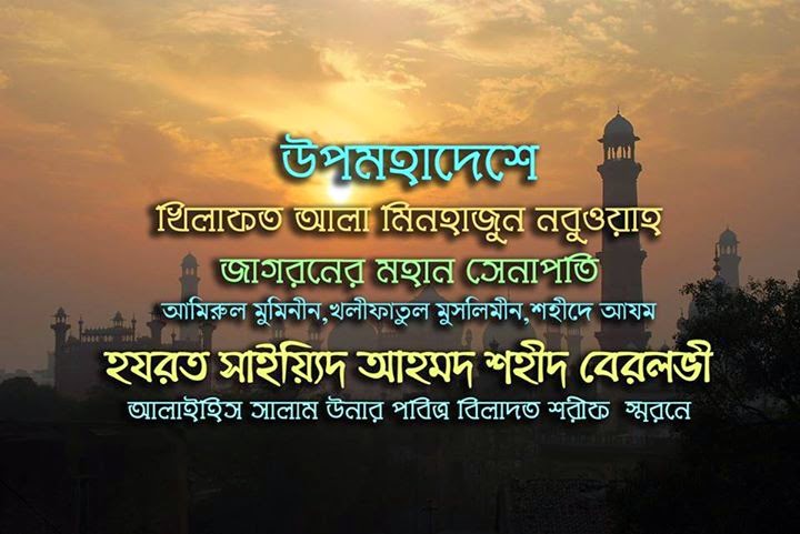 রহমাতুল্লিল ‘আলামীন, ছাহিবু সাইয়্যিদি সাইয়্যিদিল আ’ইয়াদ শরীফ, ইমামুল আইম্মাহ্, মুজাদ্দিদুয যামান, কুতুবুল আলম, মুহইউস সুন্নাহ, মাহিউল বিদয়াহ, গাউছুল আ’যম, আযীযুয যামান, ক্বইউমুজ জামান, আল জাব্বারিউল আউওয়াল, আল ক্বউইউল আউওয়াল, আস সাফফাহ, হাবীবুল্লাহ, আহলু বাইতি রসূলিল্লাহ ছল্লাল্লাহু আলাইহি ওয়া সাল্লাম, মাওলানা মামদূহ মুর্শিদ ক্বিবলা সাইয়্যিদুনা হযরত সুলত্বানুন নাছীর আলাইহিস সালাম তিনি বলেন, ১৩ শতকের মহান মুজাদ্দিদ, মুজাহিদে মিল্লাত, শহীদে বালাকোট, আমীরুল মু’মিনীন, হযরত সাইয়্যিদ আহমদ শহীদ বেরেলবী রহমতুল্লাহি আলাইহি তিনি ১ বাকি অংশ পড়ুন...