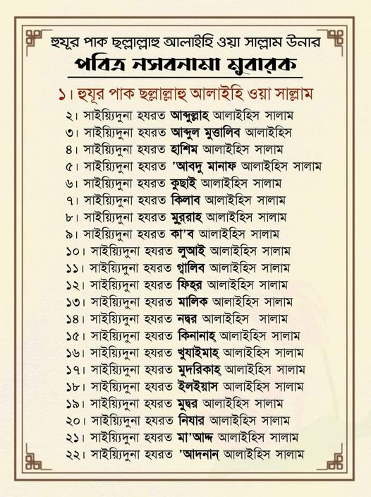 মহাসম্মানিত ও মহাপবিত্র হাদীছ শরীফ উনার মধ্যে নূরে মুজাসসাম হাবীবুল্লাহ হুযূর পাক ছল্লাল্লাহু আলাইহি ওয়া সাল্লাম তিনি ইরশাদ মুবারক করেন- اَنْسِبُـوْنِـىْ “আপনারা আমাকে মহাসম্মানিত ও মহাপবিত্র বরকতময় নসবনামাহ্ মুবারক উনার সাথে সম্পৃক্ত করুন।” এটা ইরশাদ মুবারক করে, তিনি নিজেই উনার ২২তম মহাসম্মানিত ও মহাপবিত্র পূর্বপুরুষ আলাইহিস সালাম উনার পর্যন্ত উনার মহাসম্মানিত ও মহাপবিত্র বরকতময় নসবনামাহ্ মুবারক বর্ণনা মুবারক করেছেন। সুবহানাল্লাহ! তা হচ্ছেন-