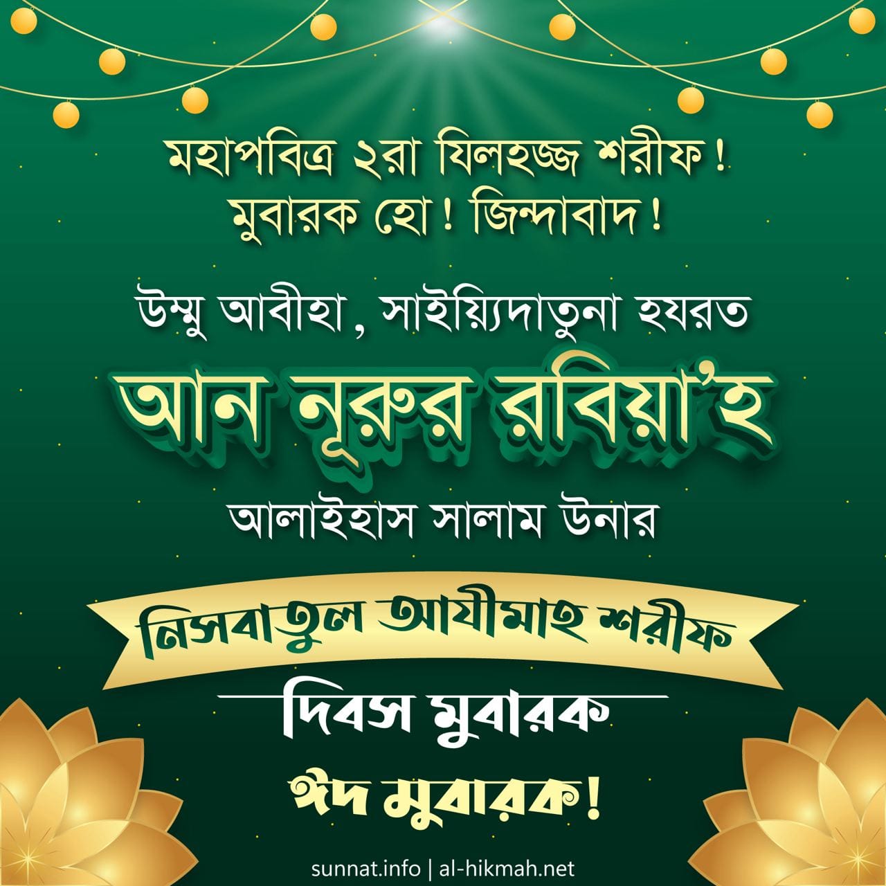 সাইয়্যিদাতু নিসায়িল আলামীন, আন নূরুর রবি‘আহ্ সাইয়্যিদাতুনা হযরত যাহরা আলাইহাস সালাম তিনি হচ্ছেন নূরে মুজাসসাম হাবীবুল্লাহ হুযূর পাক ছল্লাল্লাহু আলাইহি ওয়া সাল্লাম উনার মহাসম্মানিতা বানাত (মেয়ে) আলাইহাস সালাম। সুবহানাল্লাহ! আর এটাই উনার সর্বশ্রেষ্ঠ পরিচিতি মুবারক। সুবহানাল্লাহ! নূরে মুজাসসাম হাবীবুল্লাহ হুযূর পাক ছল্লাল্লাহু আলাইহি ওয়া সাল্লাম উনার মহাসম্মানিতা হযরত বানাত আলাইহিন্নাস সালাম উনাদের মধ্যে তিনি হচ্ছেন ‘আর রবি‘য়াহ তথা চতুর্থ।’ সুবহানাল্লাহ! উনার সম্মানিত মর্যাদা-মর্তবা মুবারক হচ্ছেন, তিনি শুধু মহান আ বাকি অংশ পড়ুন...