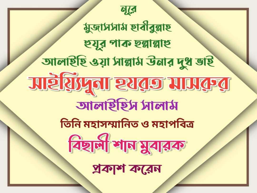 নূরে মুজাসসাম হাবীবুল্লাহ হুযূর পাক ছল্লাল্লাহু আলাইহি ওয়া সাল্লাম উনার মহাসম্মানিত ও মহাপবিত্র দুধ মাতা সাইয়্যিদাতুনা হযরত উম্মুর রদ্বা‘আহ্ আল ঊলা আলাইহাস সালাম (সাইয়্যিদাতুনা হযরত ছুওয়াইবাহ্ আলাইহাস সালাম) উনার মহাসম্মানিত ও মহাপবিত্র আওলাদ (সন্তান) হচ্ছেন সাইয়্যিদুনা হযরত মাসরূহ্ রদ্বিয়াল্লাহু তা‘য়ালা আনহু তিনি। সুবহানাল্লাহ! সাইয়্যিদাতুনা হযরত উম্মুর রদ্বা‘আহ্ আল ঊলা আলাইহাস সালাম তিনি যখন নূরে মুজাসসাম হাবীবুল্লাহ হুযূর পাক ছল্লাল্লাহু আলাইহি ওয়া সাল্লাম উনাকে মহাসম্মানিত ও মহাপবিত্র দুগ্ধ মুবারক পান করান, বাকি অংশ পড়ুন...