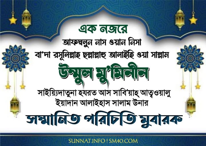সাইয়্যিদাতুনা হযরত উম্মুল মু’মিনীন আল আশিরাহ আলাইহাস সালাম উনার সম্মানিত নাম মুবারক হচ্ছেন হযরত ছফিয়াহ আলাইহাস সালাম। তিনি তৎকালীন আহলে কিতাবধারী ইয়াহুদী সম্প্রদায়ভুক্ত ছিলেন। উনার পিতা হুয়াই বিন আখতাব, ইয়াহুদী বনু নাদ্বীর গোত্রের সর্দার ছিলেন, যিনি জলিলুল ক্বদর রসূল হযরত কালীমুল্লাহ আলাইহিস সালাম উনার ভাই হযরত হারুন ইবনে ইমরান আলাইহিস সালাম উনার অধঃস্তন পুরুষ। উনার নসবনামা হচ্ছেন- হযরত ছফিয়াহ বিনতে হুয়াই আলাইহিস সালাম ইবনে আখত্বব আলাইহিস সালাম ইবনে সাঈদ আলাইহিস সালাম ইবনে আমির আলাইহিস সাল বাকি অংশ পড়ুন...