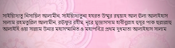 খলীফাতুল্লাহ, খলীফাতু রসূলিল্লাহ, ছাহিবু সাইয়্যিদি সাইয়্যিদিল আ’ইয়াদ শরীফ, আস সাফফাহ, আল জাব্বারিউল আউওয়াল, আল ক্বউইউল আউওয়াল, হাবীবুল্লাহ, মুত্বহ্হার, মুত্বহ্হির, আহলু বাইতি রসূলিল্লাহ ছল্লাল্লাহু আলাইহি ওয়া সাল্লাম, ক্বায়িম মাক্বামে হাবীবুল্লাহ ছল্লাল্লাহু আলাইহি ওয়া সাল্লাম, মাওলানা মামদূহ মুর্শিদ ক্বিবলা সাইয়্যিদুনা হযরত সুলত্বানুন নাছীর আলাইহিস সালাম তিনি বলেন, আহলু বাইতি রসূলিল্লাহ ছল্লাল্লাহু আলাইহি ওয়া সাল্লাম, সাইয়্যিদাতু নিসায়িল আলামীন, সাইয়্যিদাতুনা হযরত উখতু রসূল মিনার রদ্বয়াহ আলাইহাস সালাম তিনি ৯ম হিজ বাকি অংশ পড়ুন...