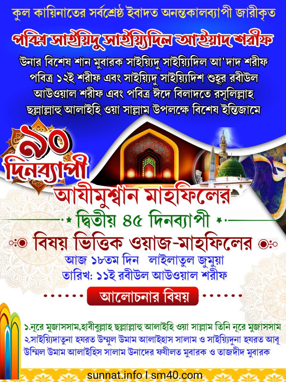 রহমাতুল্লিল ‘আলামীন, ছাহিবু সাইয়্যিদি সাইয়্যিদিল আ’ইয়াদ শরীফ, ইমামুল আইম্মাহ্, মুজাদ্দিদুয যামান, কুতুবুল আলম, মুহইউস সুন্নাহ, মাহিউল বিদয়াহ, গাউছুল আ’যম, আযীযুয যামান, ক্বইউমুয যামান, আল জাব্বারিউল আউওয়াল, আল ক্বউইউল আউওয়াল, আস সাফফাহ, হাবীবুল্লাহ, আহলু বাইতি রসূলিল্লাহ ছল্লাল্লাহু আলাইহি ওয়া সাল্লাম, মাওলানা মামদূহ মুর্শিদ ক্বিবলা সাইয়্যিদুনা হযরত সুলত্বানুন নাছীর আলাইহিস সালাম তিনি বলেন, মহান আল্লাহ পাক তিনি পবিত্র কুরআন শরীফে ‘আইয়ামুল্লাহ’ অর্থাৎ সম্মানিত বিশেষ বিশেষ দিনসমূহের কথা উল্লেখ করে ইরশাদ মুবারক করেছেন, ‘ম বাকি অংশ পড়ুন...