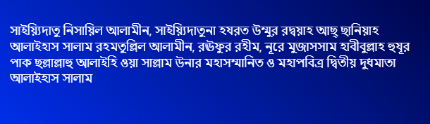 সব প্রশংসা মুবারক খালিক্ব মালিক রব মহান আল্লাহ পাক উনার জন্য; যিনি সকল সার্বভৌম ক্ষমতার মালিক। সাইয়্যিদুল মুরসালীন, ইমামুল মুরসালীন, নবী আলাইহিমুস সালাম উনাদের নবী, রসূল আলাইহিমুস সালাম উনাদের রসূল, নূরে মুজাসসাম, হাবীবুল্লাহ হুযূর পাক ছল্লাল্লাহু আলাইহি ওয়া সাল্লাম উনার প্রতি অফুরন্ত দুরূদ শরীফ ও সালাম মুবারক।